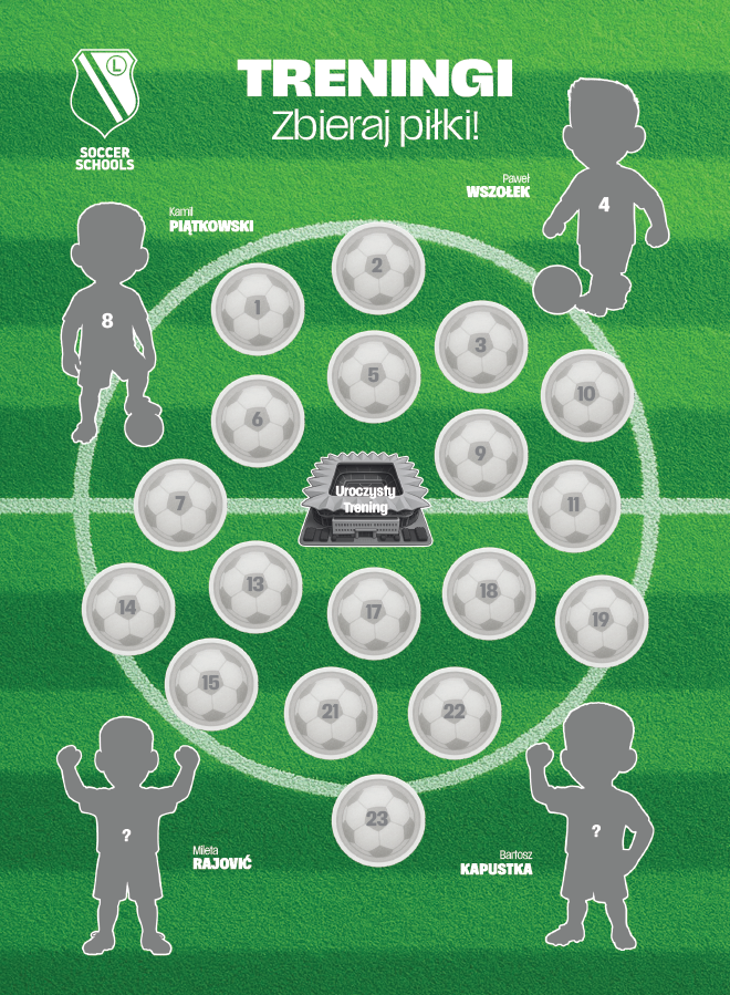 Wykorzystany jest tu motyw kolekcjonerski tak bardzo popularny wśród dzieci i młodzieży, który zakłada wydanie każdemu dziecku trenującemu w Przedszkolach karty w formacie A5, na której koordynator/trener ośrodka będzie specjalną naklejką zaznaczał jego obecność na poszczególnych zajęciach. Co czwarty trening (czyli raz w miesiącu przy pełnej frekwencji) bedzie nagradzany naklejką specjalną – dziecięcą wersją jednego z naszych piłkarzy!